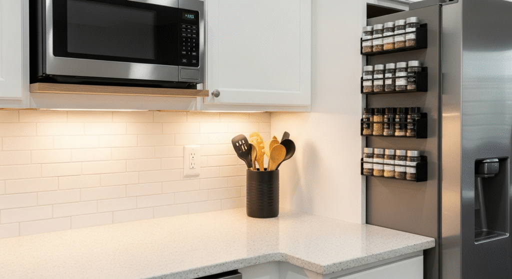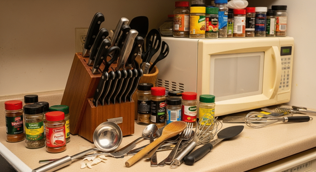 The Problem: This is a classic case of “no designated home.” The countertop became a landing strip for everything—appliances, mail, spices, and utensils—leaving zero room for actual cooking.