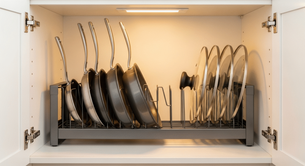 Now that you have your organizer, it’s time to create a system. Place your most-used pans (like your daily frying pan) in the easiest-to-reach slots. Group similar items together. The heavy-duty iron construction of a quality rack ensures even your heaviest cast-iron skillet has a stable, secure home.