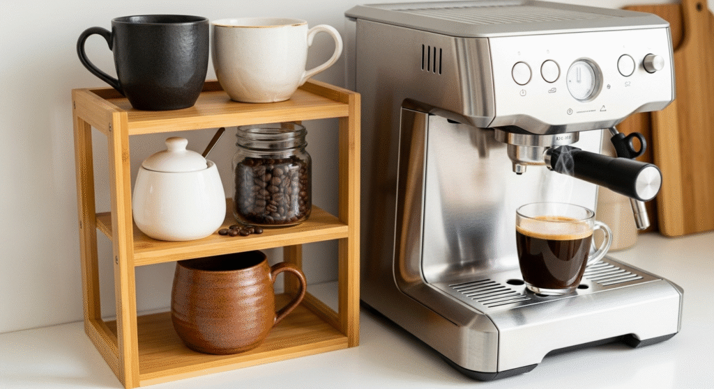 Instead of having your coffee maker, sugar, mugs, and pods scattered around, group them together to create a dedicated beverage station. Placing them all on a simple tray or a multi-level shelf instantly makes the area look intentional and tidy.