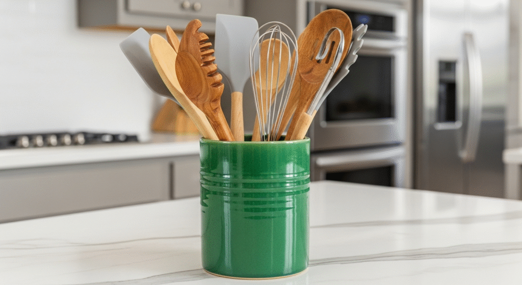 The Perfect Tool: Choose a Utensil Holder or Crock that matches your kitchen’s aesthetic, whether it’s modern stainless steel, rustic ceramic, or warm wood.