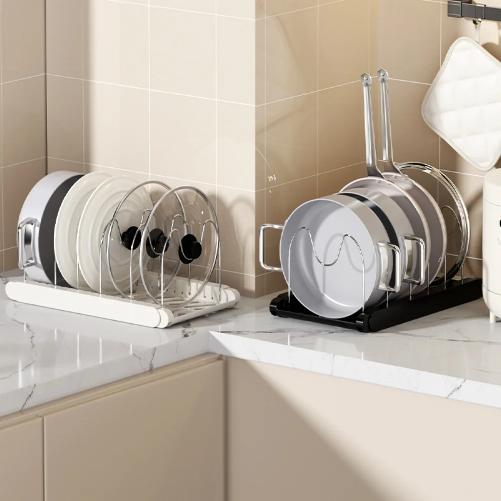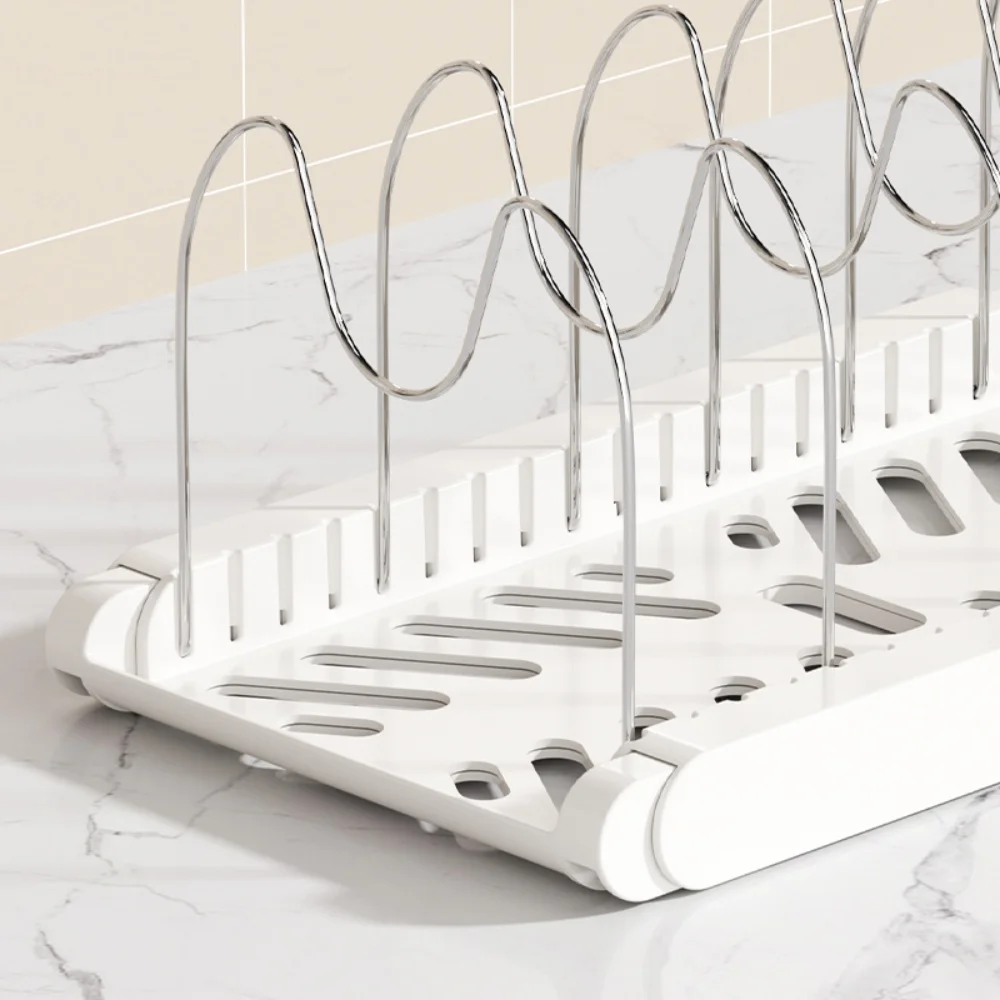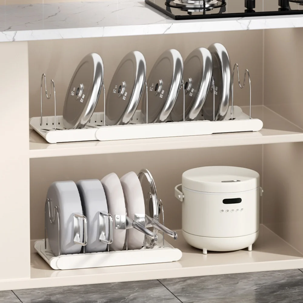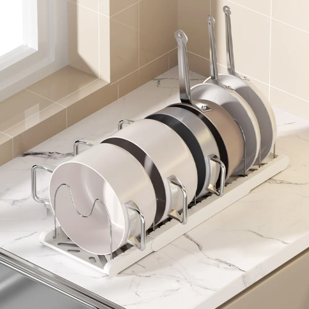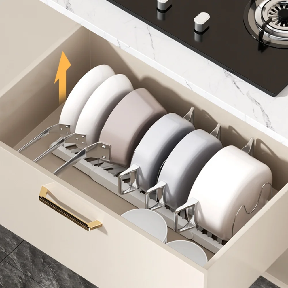 End the pan avalanche! This adjustable cabinet pot rack lets you create custom slots for every pot, pan, and lid. Heavy-duty, expandable, and protects your cookware from scratches. The ultimate silent organizer.