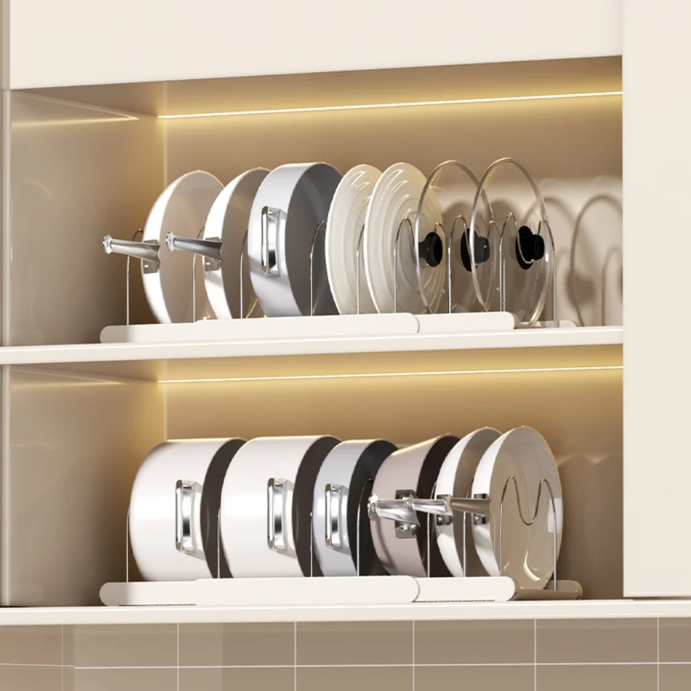 Fully Customizable for Your Cookware: Comes with multiple adjustable dividers that you can position anywhere along the base. This allows you to create the perfect-sized space for everything from small saucepans to large skillets and bulky lids.