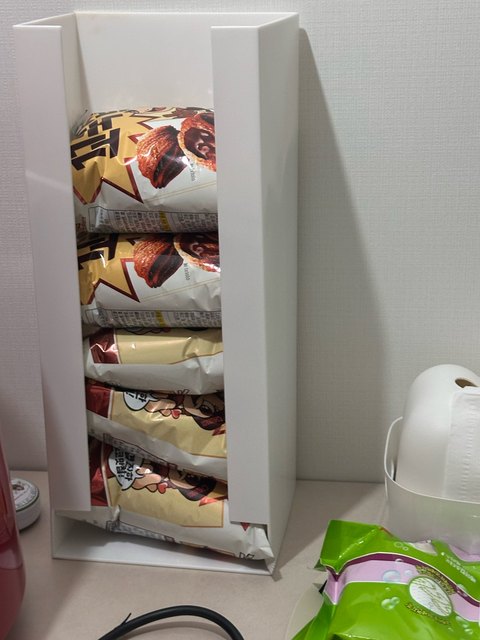 It’s perfect for storing snacks too! Even large-sized snacks fit securely inside the bag, and it’s easy to take them out and eat. I’m very satisfied. Stacking them vertically takes up less space and looks neat, making me feel better too. I want to order one more!
