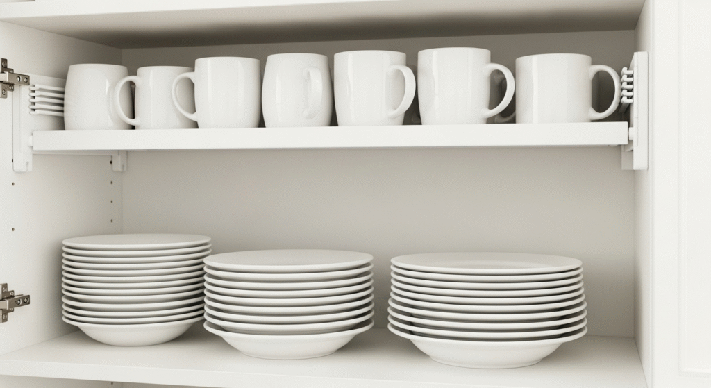 How it works: You extend the shelf until it’s firmly wedged between the two sides of your cabinet. It’s the perfect way to double your storage for plates, cans, or cleaning supplies.