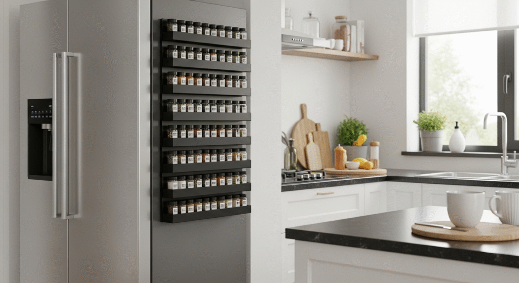 Your refrigerator is a large metal surface just waiting to be used. Powerful magnetic organizers can hold everything from spices and knives to paper towels and cleaning supplies, keeping your counters completely clear. This is one of the most effective renter friendly kitchen organization hacks available.