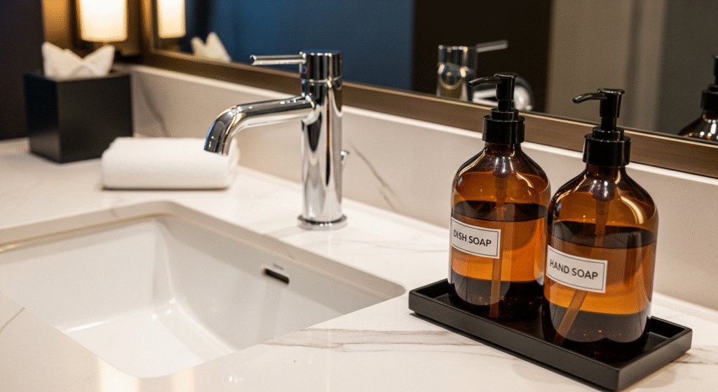 This is the number one secret of interior stylists. Get rid of the brightly colored, branded plastic bottles of dish soap, hand soap, and cooking oil. Transfer them into uniform, reusable dispensers made of glass, ceramic, or sleek plastic. This tiny change removes visual clutter and instantly makes your sink and countertop area look cohesive and expensive.