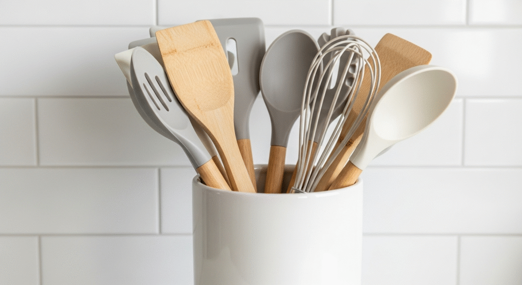 The Perfect Tool: Choose a Utensil Holder or Crock that acts as a decorative accent, whether it’s a rustic ceramic pot or a modern stainless steel cylinder.